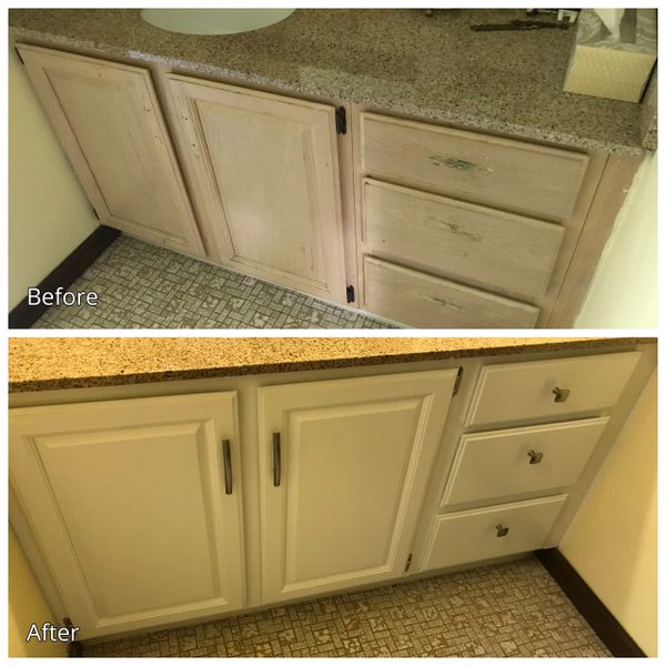 Nov 7 2015 - Before and After refinishing kitchen cabinets. Make sure you give the mixture about 20 to 30 minutes to thicken like a pancake batter. While painting the cabinets did do wonders for the kitchen.